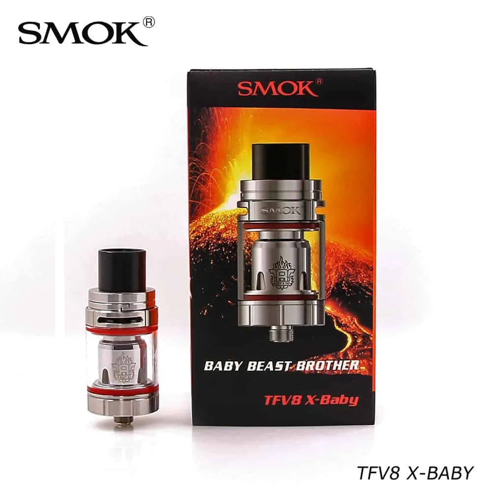 SMOK TFV8 x baby Tank TFV8 X-Baby, også kjent som «Baby Beast Brother» er en strålende ny topplufttank fra SMOK TFV-serien. Suksessen til denne tanken kommer fra mange tester og forbedringer av deres berømte Baby Beast-tank, som gir massive skyer og rikere smak. Inkluderer den klassiske svingbare toppdekseldesignen og forseglet lekkasjesikker forstøverbase.